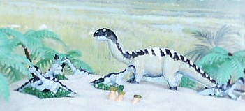 The prosauropod Plateosaurus (flat lizard) shows up in the final scene as the precursor to the giants of the Jurassic. One of the best known dinosaurs, from over a hundred skeletons, it was a large animal over 24 feet in length. It may have lived in groups and was wide spread in Laurasia. Prosauropods appear in the Triassic possibly as early as the Middle Triassic, dominate in the Early Jurassic and mysteriously disappear in the Middle Jurassic. Often they are described as the ancestors of the sauropods like Apatosaurus and Brachiosaurus. This seems unlikely as several early sauropods from the Triassic have been recently found. Prosauropods continue to diversify in the Early Jurassic developing into many smaller sized species.