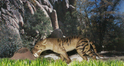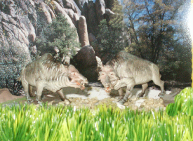 There are at least five genera of Entelodonts: Archaeotherium, Megachoerus, Dinohyus, Entelodon and Eoentelodon. Entelodonts represent an extinct family related to pigs known from North America, Europe and Asia. They ranged in size from a large dog to a large buffalo, and probably averaged cow sized. In North America, the family ranged from the Late Eocene to the Early Miocene, or about 39 to 16 million years ago. Entelodon (perfect toothed) is the best known of the family thanks to the BBC Walking with Prehistoric Beasts program. They were large omnivorous animals with nasty dispositions. Skulls with bites matching that of Enteldon show they engaged in intra species combat.