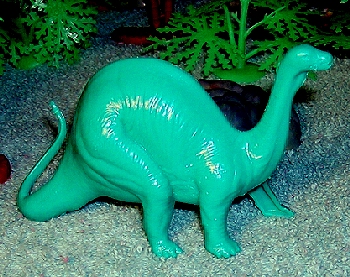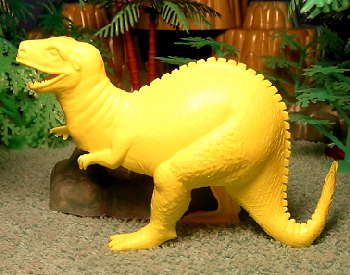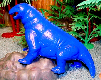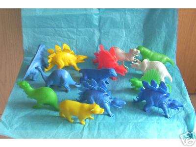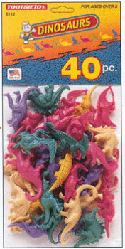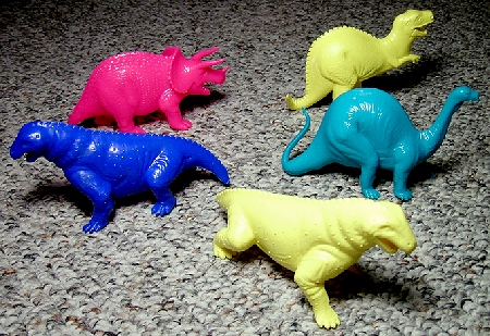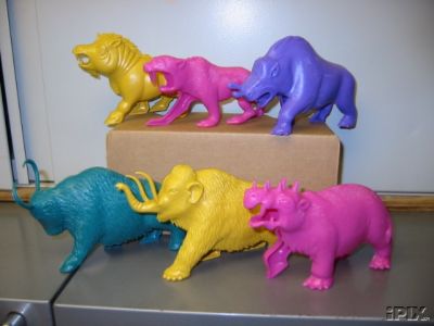 Included in Dinosaur play sets from various companies, as novelties. Still being sold by TootsieToy so I think the molds are still around. The animals came in a variety of colors. They are hollow and toothy. A favorite sandbox toy to this day.