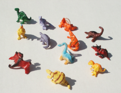 Bin figures are small vinyl figures 1 1/2 - 3 inches, not to scale usually either solid colored or two toned. The big break through is selling them in toobs or tubes. The companies best known for this format are Safari Ltd and K&M. Safari naturally has captured the high end of the market with its American Natural History Museum, Sue, Carnivorous, Dino, Prehistoric Life and baby Dino toobs some sets are painted and have the look of the high resin premiums from Japan. They have been able to tie the toob line with their high end museum lines. K&M also markets a line of toob products using custom painted figures from the generic JP set. The older retailing strategy for small figures used by Bullyland , Schleich and Play Vision was an open container that allowed them to be sold individually as impulse buys for customers. The profit per unit is higher for retailers but it requires more inventory and doesn't generate as much volume. It is a particularly unattractive to internet sellers were the shipping and packaging are issues. Toobs are easy maintenance, have less pilferage, and bring in a better total profit. The format has been picked up by a range of generic figure makers most of them nameless.