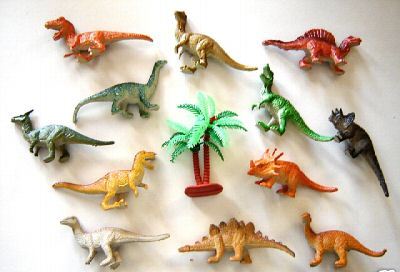 This a nice set from a Dollar Store tube. The horned tyrannosaurid stand out and the four footed spinosaur. There is a glow in the dark set. From Riff Smith Below the 24 pices set ![]() |