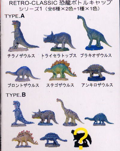 Based on 1950's Knight and Zallinger paleoart (that is the retro part) originally premiums for bottled water and mounted on plastic bottle caps. There were 2 series each released in 2 different color schemes.