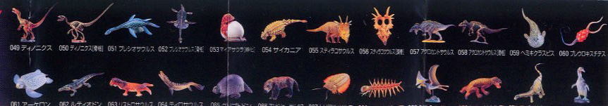 A been fad in Japan for collectable figures as premiums for various products like candy, coca cola or bottled water. Dinosaurs have been especially popular. Most seem to have been designed through Kaiyodo. There is often a mystery figure included in the set. A good price is between 3 - 8 dollars but rare pieces can be much more expensive. UHA also known as Mikuta or Choc Eggs are the most popular and successful. For information on other series and Kaiyodo models try the Japanese premiums page.
