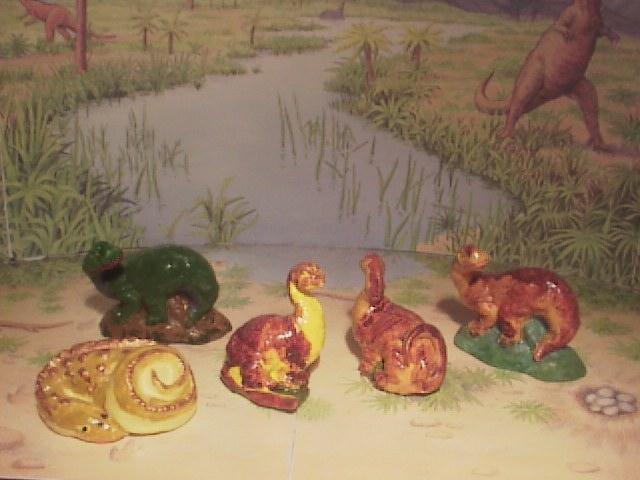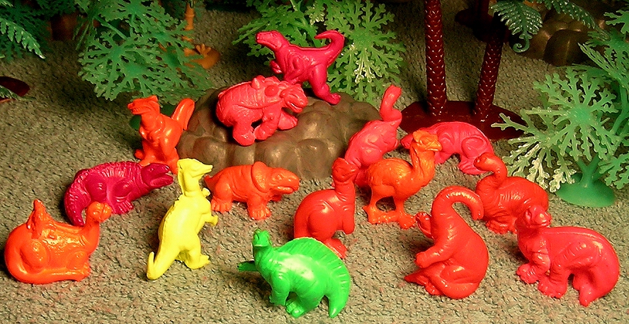 Later electric colored series courtesy of Rick Fulton. As you can see many of these figure are mismolded and need to have flash trimmed compared to the original release. Furthest left is an orange sauropod #11 with a Flintstones style rider. Just above it is a pink Sphenocdon. The yellow looks like Saurolophus and the Green Ouranosaurus. I make out Protoceratops, Euplocephalus, Oviraptor, Diatryma, Camarasaurus in the right corner. Also a Struthiomimus, Eryops, along with various other theropods and sauropods.