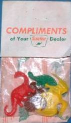 Left 6 Sinclair figures up front with a mix of Marx, MPC and Timmee. The Sinclair figures are larger the Trachodon has a crest along the back. The Ankylosaurus looks more like the Timmee figure. These are uncommon figures and routinely misidentified on Ebay auctions. Recasts showed up a few years ago in play sets with the Tootsie Toy and smooth Timmee figures.